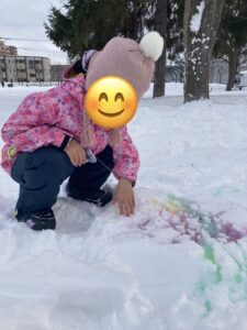 色水を雪にかけてみると、とてもカラフルに✨