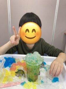 ぐちゃぐちゃにして感触を楽しんだり、寒天の中に型などを埋めて職員に探してもらう宝探しを楽しんだりと、様々な遊び方がありました♪