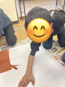 手につける方法は2種類あり、ピンクの絵の具を筆でつけるチームと、直接赤と白の絵の具を手のひらで混ぜるというチームに分かれました!