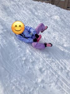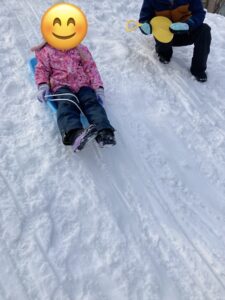 大きな雪玉を作って雪合戦をしようとしたり、山の斜面に小さなジャンプ台を作って、ソリで飛ぶチャレンジをしたりと、1時間たっぷりとても楽しんでいました☺️